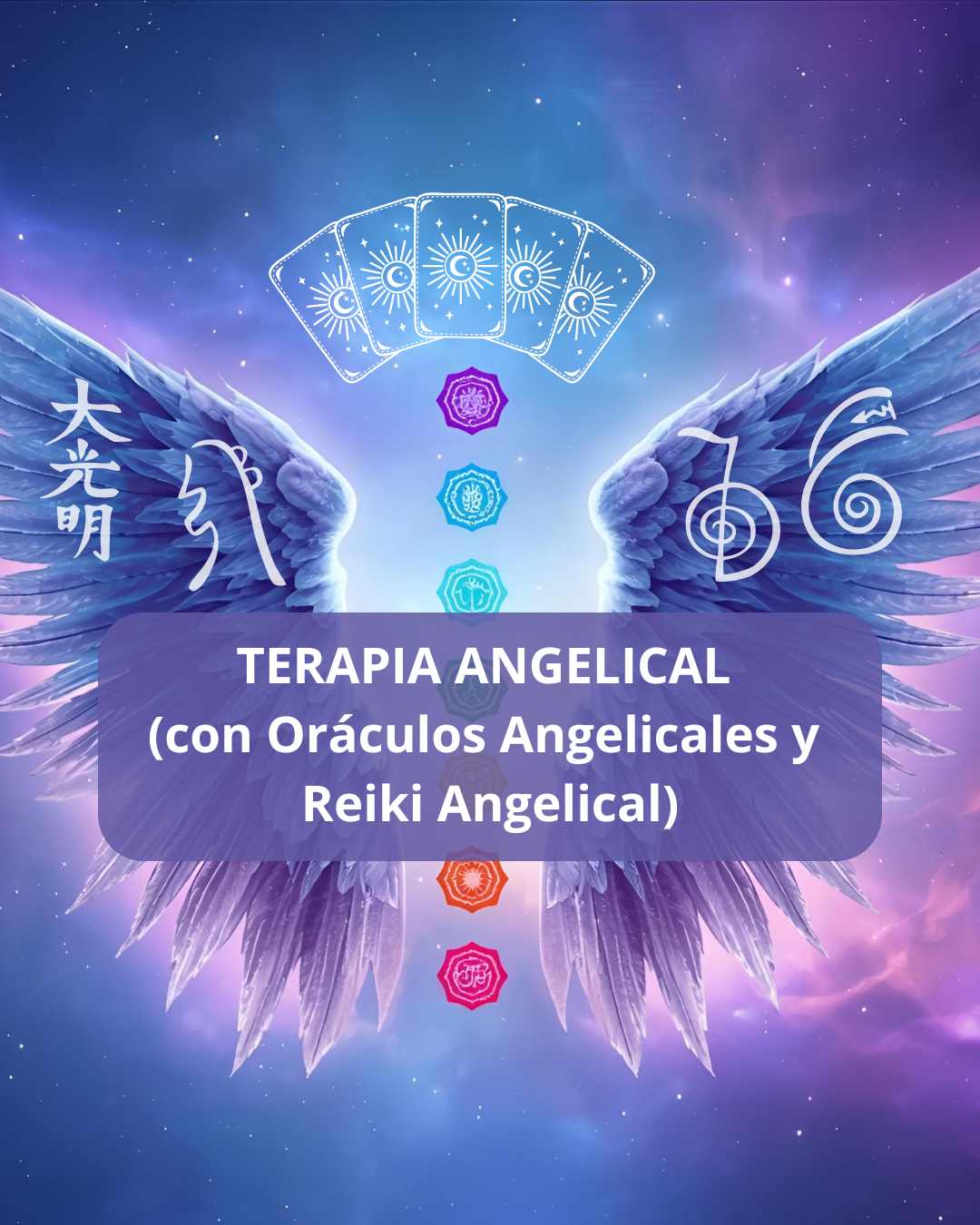 Es una terapia de sanación y guía de los ángeles integral, donde recibes energía sanadora con Reiki Angelical a través de la imposición de manos donde se emplea la energía sanadora de los 7 arcángeles y los símbolos del reiki Usui sobres los 7 charkras para una sanación y transformación profunda. Además recibes mensajes sobre las diferentes áreas de tu vida que necesites recibir ayuda. La información se entrega al consultante a través de las herramientas de los oráculos angelicales y la canalización.
